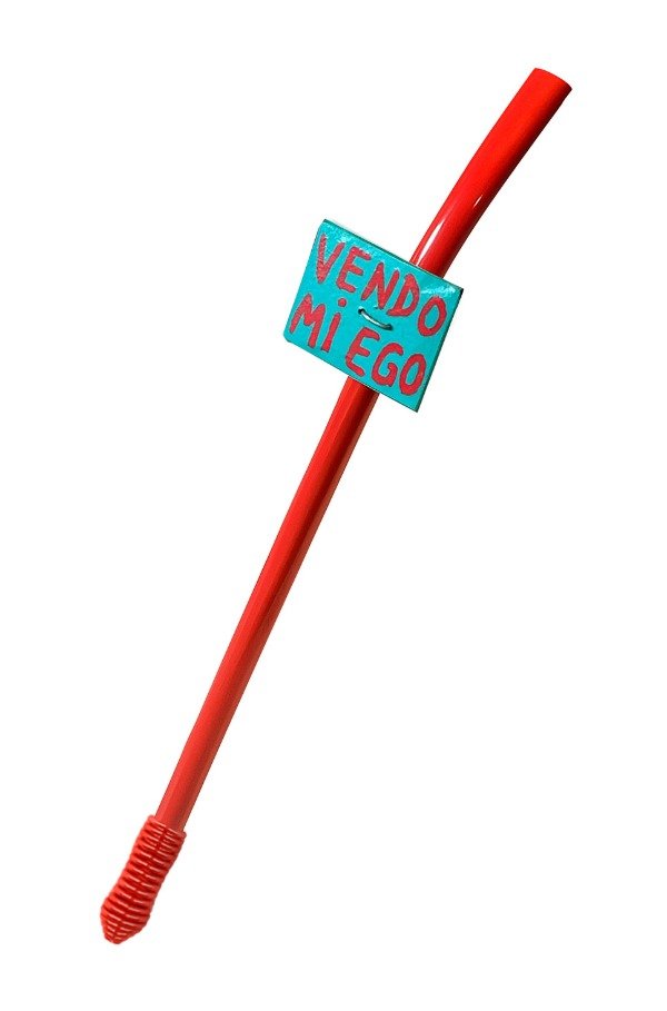 Bombilla roja con cartel VENDO MI EGO pintado a mano y barnizado